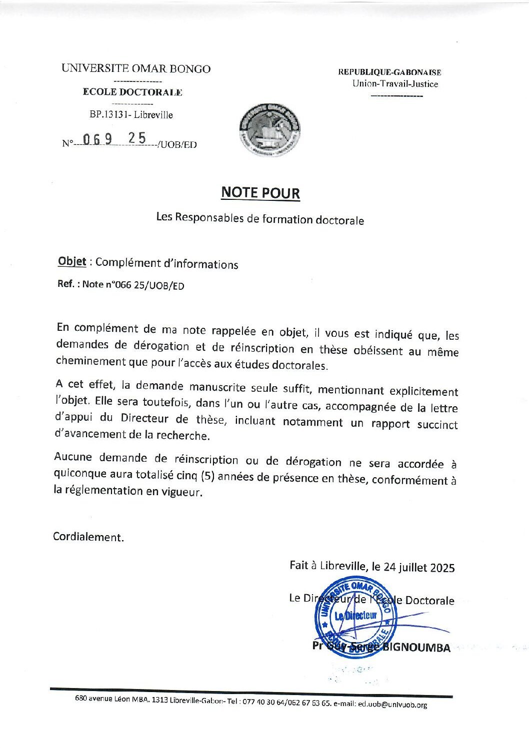 Vendredi 17 octobre 2025. Conduite par le Commandant ELLI BEKALÉ, une soixantaine d’Officiers stagiaires de l’École d’État-Major Régionale de Libreville (EEML), originaires de dix (10) pays africains, se sont rendus sur le campus de l’UOB afin de procéder à leur inscription administrative au programme de Master conjoint UOB-EEML Sécurité, Défense et Gestion des…